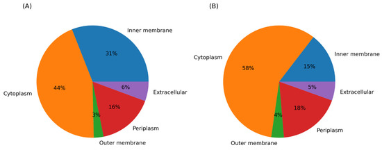 Subcellular protein localization of the proteins of the DEGs, (A) proteins of upregulated and (B) downregulated genes.