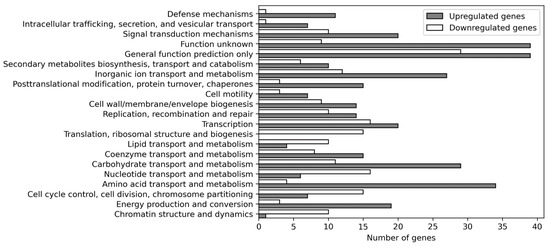 Functional annotation of the proteins of the DEGs according to the COG pathways uncovered that more genes with predicted protein functions are up- than down-regulated (Figure 7). The four most important pathways were “amino acid transport and metabolism”, “carbohydrate transport and metabolism”, “inorganic ion transport and metabolism”, and “cell membrane biogenesis”. This indicates that the cell membrane, primary metabolism, and metabolite transport are the primary targets of Al stress. Interestingly, proteins categorized as “Chromatin structure and dynamics”, “cell cycle control”, “cell division, chromosome partitioning”, or “translation, ribosomal structure, and biogenesis” are mainly downregulated. This demonstrates that Al stress down-regulates general processes associated with gene expression and DNA alterations leading to cell division. It is also necessary to note that many DEGs code for proteins with no or little defined functions (“general function prediction only”, “function unknown”).