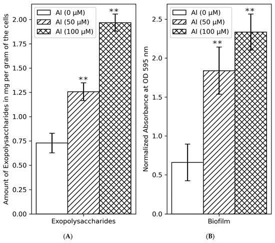 Amount of produced exopolysaccharides (A) and biofilm formation (B) by isolate B3 under different concentrations of Al. Asterisks represent the significant differences in the quantity of EPS and biofilm between Al-treated samples and untreated controls (one-way ANOVA; ** p ≤ 0.001).