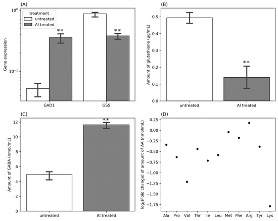Expression of GAD1 and GSS genes by RT-qPCR (A), fold change of the amounts of GSH (B), γ-aminobutyric acid (C), and amino acids (D) in Al-treated cells relative to the untreated controls. Asterisks represent significant differences in the expression levels of GAD1 and GSS genes (A), amount of GSH (B), and GABA (C) between Al-treated samples and untreated controls (one-way ANOVA; ** p ≤ 0.001).