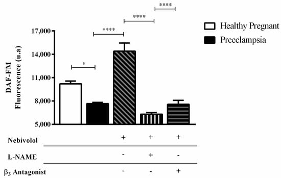 Human umbilical vein endothelial cells (HUVEC) (EA.hy 926) were cultured until reaching 80–90% of confluence. HUVEC were incubated in supplemented DMEM with 10% (v/v) plasma from PE or HP and 10 µM of NEB, 100 µM of L-name (NOS inhibitor), 3 µM of L-748,337 (β3 antagonist), for 4 h. Cells were used until the 10th passage.