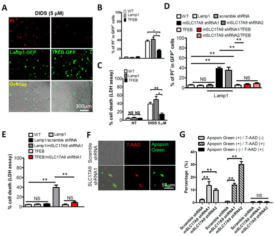 TFEB overexpression rescued apoptotic cell death induced by SLC17A9 deficiency. (A,B) TFEB overexpression rescued cell death induced by DIDS. Cos1 cells sham-transfected or transfected with Lamp1-GFP or TFEB-GFP were treated with 5 μM DIDS for 24 h. TFEB but not Lamp1 overexpression significantly reduced the percentage of PI+ cells. The percentage of PI+ cells in each experiment was calculated from ≥250 cells from randomly chosen fields, and the experiment was repeated independently 3 times in triplicate. (C) Percentage of cell death indicated by LDH assay showed that TFEB overexpression dramatically decreased cell death. The experiment was repeated 3 times in triplicate. (D,E) TFEB overexpression rescued SLC17A9 silence mediated cell death. C2C12 cells were transfected with Lamp1-GFP/SLC17A9 shRNA or TFEB-GFP/SLC17A9 shRNA using the Neon® electroporation system. (F,G) The modalities of cell death were determined using an Apoptosis/Necrosis Assay Kit. SLC17A9 deficiency induced both early-stage (green) and late-stage (green and red) apoptosis but not necrosis (red). The experiment was repeated independently 3 times in triplicate and representative images are shown. WT: wild type (sham-transfection); NT: no treatment; NS: not significant. * p < 0.05; ** p < 0.01.