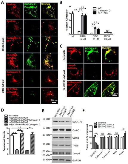 Texas Red 10 kD Dextran (Invitrogen, 1 mg/mL) was used to label lysosomes. LysoTracker Red DND-99 (Invitrogen, 50 nM) was used to indicate acidic lysosomes. DQ-BSA (Invitrogen, 10 μg/mL) was used to detect lysosomal function. BODIPY FL-pepstatin A (Invitrogen, 1 μM) was used to stain active Cathepsin D. A Magic Red™ Cathepsin B Assay Kit (ImmunoChemistry Technologies, Bloomington, MN, USA) was used to stain active Cathepsin B. 4, 4′-Diisothiocyano-2, 2′-stilbenedisulfonic acid (DIDS, 5 μM, Tocris Bioscience, Bristol, UK) was used to inhibit SLC17A9.