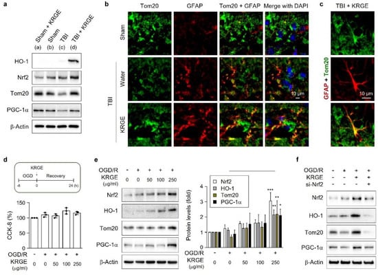 After TBI, damaged vascular cells may cause an O2- and glucose-deficient status [18]. Hence, we pretreated human astrocytes with OGD for 8 h, followed by recovery for 24 h (OGD/R) (Figure 1d). The treatment of human astrocytes with various concentrations of KRGE during recovery did not affect their cell viability, assessed with a cell-counting kit-8 (CCK-8) assay (Figure 1d). By contrast, KRGE increased the expressions of mitochondria-related proteins (e.g., Nrf2, HO-1, Tom20, and PGC-1α) in a concentration-dependent mode (Figure 1e). Nrf2 is an upstream factor for HO-1 [19]; therefore, we explored the impact of Nrf2 knockdown on protein levels of HO-1, Tom20, and PGC-1α by KRGE in OGD/R conditions (Figure 1f). Nrf2 knockdown effectively reduced the KRGE-mediated elevated expression of Nrf2, HO-1, Tom20, and PGC-1α using Nrf2-specific siRNA (si-Nrf2) in astrocytes (Figure 1f and Supplementary Figure S1c). KRGE-induced Tom20 could be partially associated with the Nrf2-HO-1 axis in the astrocytes located in peri-injured regions of TBI.