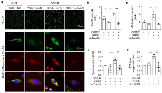 We examined the roles of Tom20 in the energy production of astrocytes exposed to KRGE in OGD/R conditions. The treatment of human astrocytes with si-Tom20 significantly reduced the intensity of KRGE-induced Tom20 in OGD/R conditions, assessed with immunocytochemistry (Figure 3a, upper). The density and shape of nuclei were nearly the same in all groups and showed a similar cell condition (Supplementary Figure S2). si-Tom20 reduced the immunoreactivity of Mitotracker, a mitochondria membrane potential marker (Figure 3a, lower), which was critically increased by KRGE (Figure 3b,c). An interesting finding was that KRGE increased O2 consumption and ATP production via a Tom20-dependent pathway (Figure 3d,e). Thus, astrocyte-derived Tom20 may have a key role in mitochondrial activity and energy production in KRGE-treated OGD/R conditions.