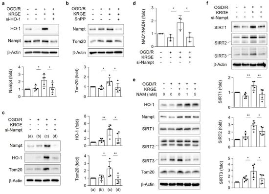 Astrocyte treatment with two combinatory HO metabolites—namely CO and bilirubin—increased Nampt levels [20]. Intracellular Nampt exerts an enzymatic activity that is responsible for salvaging the pathways of NAD+ synthesis, thereby activating NAD+-dependent protein deacetylases [10,20]. Thus, we determined the relationship between HO-1 and Nampt in the KRGE-treated OGD/R conditions. Astrocytes subjected to KRGE in OGD/R conditions revealed upregulated Nampt, which was significantly reduced by si-HO-1 (Figure 4a) or the HO inhibitor SnPP (Figure 4b). KRGE-induced HO-1 expression in OGD/R conditions was interestingly markedly blocked by si-Nampt (Figure 4c). Nampt crosstalk with HO-1 consequently leads to the upregulation of Tom20 protein (Figure 4b,c).