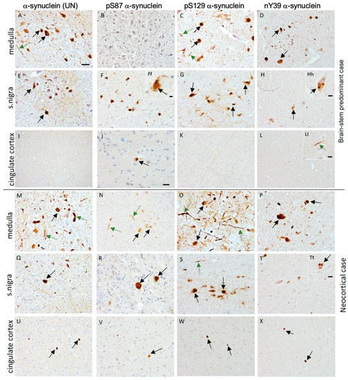 Illustration of immunostaining for different α-synuclein antibodies in IPD cases. (A–L) Regions from a brainstem-predominant PD case. (A,E,I) Immunostaining with α-synuclein (UN) showing LBs (black arrows) and LNs (green dashed arrows) in medulla and nigra but not in cingulate cortex. Very few LBs or LNs were positive for pS87 α-synuclein, as shown in (B,F,J). Positive immunostaining of LBs and LNs in medulla and nigra but not in cingulate was observed with pS129 α-synuclein antibody. Some nonspecific staining of white matter tracts was observed (K). Immunopositivity in LBs and LNs seen for nY39 α-synuclein antibody in the medulla (D) and nigra (H,Hh) and some LNs (L,Ll) in the cingulate cortex. (M–X) Regions from a neocortical PD case where higher numbers of LBs and LNs were immunopositive with all 4 antibodies. Scale bar: 20 μm in all except in (J) where it is 10 μm. Scale bar in insets (Hh,Ll,Tt) is 8 μm.