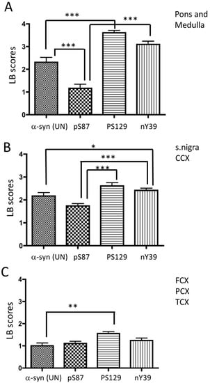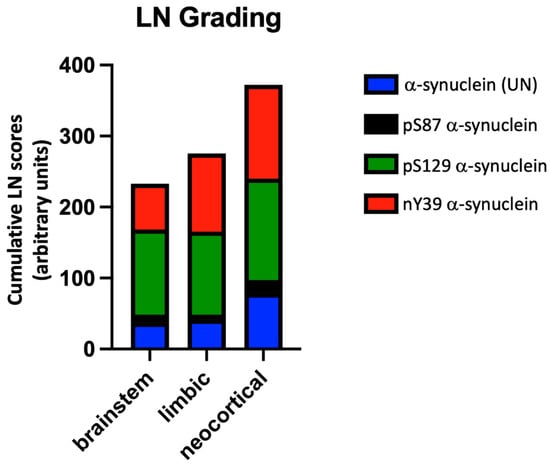 Cumulative LB scores are shown for early-, midway-, and late-affected anatomical brain regions in Figure 2. The differences between α-synuclein PTMs were tested using the Kruskal–Wallis test with multiple comparisons. The LB grading scheme used for the purpose of this study is summarized in Table 3.