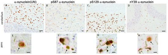 The staining patterns observed in MSA cases were akin to those observed in PD in the context of the different antibodies we have used. For instance, the pS87 α-synuclein antibody demonstrated the palest-appearing aggregates in the cerebellum (Figure 4B). pS87 α-synuclein was dominantly observed in GCIs in both pons and cerebellum, accompanied by some threads in some of the cases. In MSA, neuronal inclusions were very rarely detected with this antibody, implying that this modification may not play a role early on in disease []. Likewise, pS129 α-synuclein staining was denser, wherein this antibody preferentially recognized both neuronal and glial inclusions, as well as threads in the cerebellum and pons (Figure 4B,G). Alongside, we observed more thread-like structures and some neuronal inclusions with nY39 α-synuclein antibody in the pons (Figure 4H) compared to the cerebellum where the dominant aggregates were GCIs (Figure 4D). In particular, a higher density of pathology was demonstrated in the medulla and pontine regions in the MSA cases, mainly in GCIs with α-synuclein (UN) and pS129 α-synuclein antibodies. Lower numbers of GCIs were immunopositive for nY39 α-synuclein in all the regions examined compared to α-synuclein (UN) and pS129 α-synuclein. The pS129 α-synuclein antibody demonstrated fewer thread-like structures in MSA cases. The staining with pS129 α-synuclein was profound, and subcortical axonal fibers were recognized in the same manner as in IPD cases.