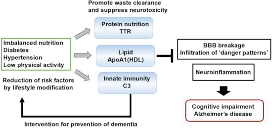 - Liu, S.; Suzuki, H.; Ito, H.; Korenaga, T.; Akatsu, H.; Meno, K.; Uchida, K. Serum Levels of Proteins Involved in Amyloid-β Clearance Are Related to Cognitive Decline and Neuroimaging Changes in Mild Cognitive Impairment. Alzheimers Dement. 2019, 11, 85–97. [Google Scholar] [CrossRef] [PubMed]