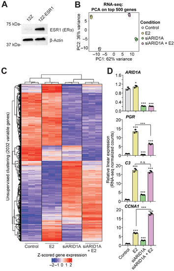 Figure 1. Differential gene expression response to estrogen signaling following the loss of ARID1A expression. (A) Confirmation of ESR1 expression in 12Z-ERS1 cells by western blot. β-Actin was used as a loading control. (B) Principal component analysis on top 500 variable genes from RNA-seq on 12Z-ESR1 cells following treatment with 10 nM estrogen (E2, yellow), siRNA knockdown of ARID1A (siARID1A, green) or E2 + siARID1A (pink) compared to control (silver). (C) Unsupervised clustering of samples based on the expression of 2032 genes (rows) selected by variance across the experimental design (rlog variance > 0.05). Heatmap displays relative expression as Z-scored rlog counts. Red values indicate high relative gene expression, and blue values indicate low expression. (D) Examples of gene expression alterations following treatment with E2 (yellow), siARID1A (green) or E2 + siARID1A (pink) compared to control (silver). Y-axis represents linear relative gene expression with respect to the control condition. Means ± SDs, n = 3. The statistic is DESeq2 FDR. * FDR < 0.05, *** FDR < 0.001, n.s. is non-significant.