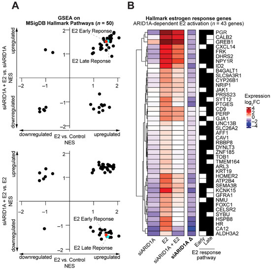 Most endometrial cancer cell lines do not express ESR1 and harbor ARID1A mutations (Figure S1) as well as other cancer-driver mutations [55]. Therefore, to investigate the role of estrogen signaling in endometrial epithelial cells, we utilized the immortalized 12Z cell line [29]. 12Z cells were transfected with the Precision LentiORF (horizon) plasmid containing a human ESR1 open reading frame cDNA to develop a cell line with stable ESR1 expression. Stable expression of ESR1 was developed under selection with Blasticidin. Protein expression of ESR1 was confirmed by western blot (Figure 1A). Then, 12Z cells with stable expression of ESR1 (henceforth, 12Z-ESR1 cells) were transiently transfected with ARID1A siRNAs (siARID1A) or non-targeting RNAs [24]. After transfections, 12Z-ESR1 cells were treated with 10 nM estrogen (estradiol, E2) or vehicle for 24 h. At this time, RNAs were collected for transcriptome analysis by RNA-seq. Principal component analysis based on gene expression revealed clear segregation by ARID1A knockdown or E2 treatment (Figure 1B). Unsupervised clustering of 2032 variable genes revealed that ARID1A loss had a larger effect on gene expression than E2 (Figure 1C). However, numerous patterns of estrogen-regulated gene expression were observed, including genes that are dependent upon ARID1A for estrogen-mediated induction (PGR), not augmented by ARID1A loss (C3), or augmented by ARID1A loss (CCNA1) (Figure 1D). As with PGR, C3 is a well-defined ESR1 target gene [59,60,61], suggesting high variability in the role of ARID1A in regulating estrogen-induced, ESR1-dependent gene expression. We performed Broad Gene Set Enrichment Analysis (GSEA) on these RNA-seq data and observed that many of the MSigDB Hallmark pathways were significantly upregulated by E2 treatment independent of ARID1A loss (Table 1). Pathways related to estrogen signaling itself (estrogen response early, estrogen response late) appeared to be upregulated upon E2 treatment but reduced in ARID1A knockdown cells treated with E2 compared to E2 treatment alone (Figure 2A). We examined the expression of each gene in these pathways and identified 43 Hallmark estrogen response genes that display ARID1A-dependent induction by estrogen (Figure 2B). These results suggest that ARID1A is required for the expression of certain estrogen target genes in response to estrogen stimulation.