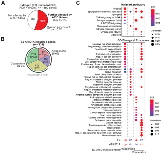 Among the 1699 genes significantly differentially expressed upon E2 treatment of 12Z-ESR1 cells (FDR < 0.0001), 939 were further affected by the loss of ARID1A (Figure 3A). Most overlapping genes (64.4%) were normally cooperatively regulated by E2 and ARID1A (i.e., different direction of perturbation with ARID1A loss and E2 treatment, suggesting that normal ARID1A function is cooperative with E2), with the remaining 35.6% of genes classified as exhibiting antagonistic regulatory activity (Figure 3B). Gene set enrichment analysis was then performed for MsigDB Hallmark pathways and GO Biological Processes. Strikingly, Hallmark estrogen target genes were enriched among genes cooperatively activated by E2 and ARID1A, while EMT, cell adhesion, and wound healing responses were often cooperatively downregulated in response to estrogen (Figure 3C). Furthermore, E2 and ARID1A appear to regulate metabolic pathways, including glycolysis and cholesterol homeostasis, antagonistically (Figure 3C). These results suggest ARID1A facilitates estrogen-mediated gene expression, both among genes induced and repressed by estrogen signaling. Known pathological processes regulated by ARID1A in endometrial models [23,24,25,26], like EMT, migration, adhesion, and wound healing, are indicated as being normally suppressed by estrogen signaling, which supports cooperative roles for ARID1A and estrogen signaling in the maintenance of endometrial epithelial identity.