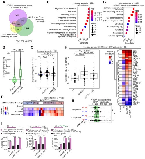 Figure 4. ARID1A directly regulates estrogen-induced changes to cell identity. (A) Overlap between differentially expressed genes from E2 vs. Control (n = 1699, yellow) and siARID1A vs. Control (n = 4128, green) in 12Z-ESR1 cells and genes with ARID1A promoter binding by ChIP-seq in 12Z cells (n = 3843, pink) as previously described [24]. (B) Violin plot of ChIP signal for ARID1A binding at 436 intersect genes (as in A) compared to all genes. The unpaired, 2-tailed Wilcoxon was used for analysis. (C) Expression log2 fold-change values of 436 intersect genes following treatment with E2, siARID1A, or both E2 and siARID1A. The paired, 2-tailed Wilcoxon test was used for analysis. Box-and-whiskers plotted in the style of Tukey without outliers. (D) Clustering of 436 genes based on relative gene expression in each condition. Clusters have been labeled as antagonistic (red for upregulted or blue for downregulated) or cooperative (purple) in their regulation by E2 and ARID1A. (E) ARID1A binding among intersect genes segregated into 4 groups based on their direction of gene expression change following E2 or siARID1A treatment. (F) Pathway enrichment analysis of 436 intersect genes for Gene Ontology (GO) Biological Process. (G) Pathway enrichment analysis of 436 intersect genes for MSigDB Hallmark pathways. (H) Left, fold-change values of 36 Hallmark EMT genes found among the 436 intersect genes following treatment with E2, siARID1A, or both E2 and siARID1A. The statistic represented is from the paired, 2-tailed Wilcoxon test. Box-and-whiskers plotted in the style of Tukey without outliers. Right, relative expression of individual 36 EMT intersect genes as a clustered heatmap. (I) Enrichment of DE genes affected by E2 treatment, ARID1A loss, or both for genes with active promoters directly inside of super-enhancer (SE, pink) (n = 163) (left), promoters within 50 kb of a super-enhancer (n = 493) (center), or genes linked to super-enhancer by the GeneHancer database (n = 1576) (right) compared to enrichment for all active genes (black). Hypergeometric enrichment was used for analysis.