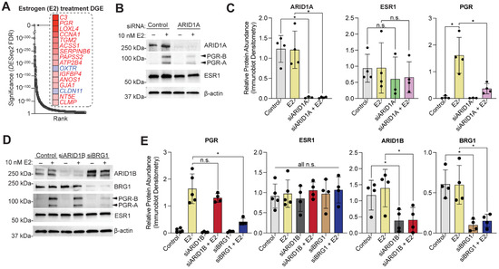 Figure 5. SWI/SNF mediates activation of PGR expression following E2 stimulation. (A) Rank visualization of top estrogen-regulated genes in 12Z-ESR1 cells. Red indicates upregulated genes, blue indicates downregulated genes. (B) Western blot analysis in 12Z-ESR1 cells following treatment with E2, siARID1A, or both E2 and siARID1A for ARID1A, PGR, and ESR1. PGR isoforms are indicated by arrowheads. β-Actin was used as a loading control. Blot is representative of 4 independent experiments. (C) Densitometry analysis of protein expression of ARID1A, PGR, and ESR1 following western blot as in panel B for control (silver), E2 (yellow), siARID1A (green) and siARID1A + E2 (pink). Densitometry values were normalized to β-Actin. Means ± SDs, n = 3–4. The paired t-test was used for analysis. (D) Western blot analysis in 12Z-ESR1 cells following treatment with E2, siBRG1, siARID1B, siBRG1+E2, or siARID1B+E2 for ARID1B, BRG1, PGR, and ESR1. PGR isoforms are indicated by arrowheads. β-Actin was used as a loading control. Blot is representative of 4 independent experiments. (E) Densitometry analysis of protein expression of ARID1B, BRG1, PGR, and ESR1 following western blot as in panel D for control (silver), E2 (yellow), siARID1B (charcoal), siARID1B + E2 (red), siBRG1 (brown) and siBRG1 + E2 (purple). Densitometry values were normalized to β-Actin. Means ± SDs, n = 4–5. The statistic is paired t-test. * p < 0.05; n.s. is non-significant.