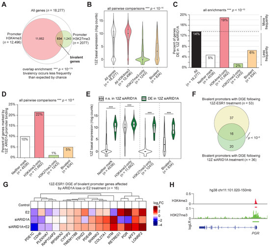 Figure 6. ARID1A regulation of bivalent gene promoters. (A) Proportional Euler diagram displaying overlap between genes with promoter H3K4me3 (n = 12,496, red) or H3K27me3 (n = 2077, green) among all expressed genes (n = 18,277, white). Hypergeometric enrichment was used for analysis. (B) Violin plot of 12Z basal expression of all genes with H3K4me3 at the promoter (red), genes with both H3K4me3 and H3K27me3 at the promoter (bivalent, yellow), and genes with only H3K27me3 at the promoter (green) relative to all genes (white). The unpaired, 2-tailed Wilcoxon test was used for analysis. 12Z gene expression from GSE121198 [24]. (C) Percent of genes with differential gene expression following siARID1A treatment of 12Z cells among genes with bivalent promoters (yellow), H3K4me3 only (red), H3K27me3 only (green), or neither (white) relative to all genes (black). Hypergeometric enrichment was used for analysis. (D) Percent of genes with ARID1A binding at the promoter among genes with bivalent promoters (yellow), H3K4me3 only (red), H3K27me3 only (green), or neither (white). The 2-tailed Fisher’s exact test was used for analysis. (E) Violin plot of basal expression of all genes with bivalent promoters, H3K4me4 only, H3K27me3 only, or neither, further segregated based on whether the gene exhibited differential gene expression following ARID1A loss (green) or not (white) in 12Z cells. The unpaired, 2-tailed Wilcoxon test was used for analysis. (F) Proportional Euler diagram displaying overlap between bivalent genes with differential gene expression in 12Z-ESR1 cells following E2 treatment (n = 53, yellow) and 12Z cells following ARID1A loss (n = 36, green) Hypergeometric enrichment was used for analysis (G) Differential expression heatmap of 16 genes from an overlapping group of panel F. (H) Genomic snapshot of ChIP signals for H3K4me3 (red) and H3K27me3 (green) at the PGR locus of 12Z cells. For signal tracks, the y-axis represents the assay signal-to-noise presented as the log-likelihood ratio (logLR) as reported by MACS2, and the small bars below the tracks represent replicate overlapping peaks. *** p < 0.001.