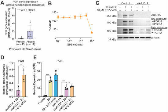 Figure 7. SWI/SNF antagonizes PCR2 to promote PGR expression following estrogen stimulation. (A) PGR gene expression (quantified by RPKM (Reads Per Kilobase of transcript, per Million mapped reads) at 95% confidence interval (CI)) in human tissue samples with (purple) vs. without (grey) promoter H3K27me3, taken from the NIH Epigenomics Roadmap. (B) Cell growth assay of 12Z cells treated with EPZ-6438 at concentrations from 100 nM to 100 μM. M is moles.(C) Western blot analysis in 12Z-ESR1 cells following treatment with E2, siARID1A or both, with or without 10 µM EPZ-6438 treatment, for ARID1A, PGR and ESR1. PGR isoforms are indicated by arrowheads. β-Actin was used as a loading control. Blot is representative of 2 independent experiments. (D) Densitometry analysis of protein expression of PGR following western blot as in panel C for siARID1A + E2 (pink) or siARID1A + E2 + EPZ-6428 (orange). Densitometry values were normalized to β-Actin are relative to the E2 only condition. Means ± SDs, n = 2. The statistic is paired t-test. (E) Quantitative PCR (qPCR) analysis of PGR gene expression 12Z-ESR1 cells following treatment with 10 nM E2 (yellow), 10 nM E2 + 10 µM EPZ-6438 (blue), siARID1A (green), siARID1A + E2 (pink), and siARID1A + 10 nM E2 + 10 µM EPZ-6438 (orange) relative to control (grey). Data represents 3 biological replicates, means ± SD. The unpaired t-test was used for analysis. * p < 0.05; *** p < 0.001.