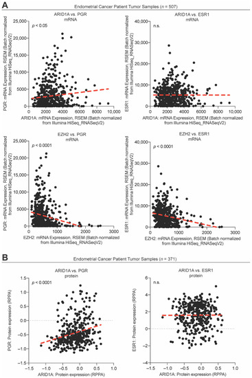 Figure 8. Correlations between PGR, ESR1, ARID1A, and EZH2 among endometrial cancer patient tumor samples. (A) Endometrial cancer tumor sample mRNA expression from 507 samples for ARID1A and PGR (upper left), ARID1A and ESR1 (upper right), EZH2 and PGR (lower left), and EZH2 and ESR1 (lower right). The red dashed line represents a linear regression. The statistical test used is the Pearson’s test. (B) Endometrial cancer tumor sample protein expression from 371 samples for ARID1A and PGR (left) and ARID1A and ESR1 (right). The red dashed line represents a linear regression. The statistical test used is the Pearson’s test. n.s. is non-significant.