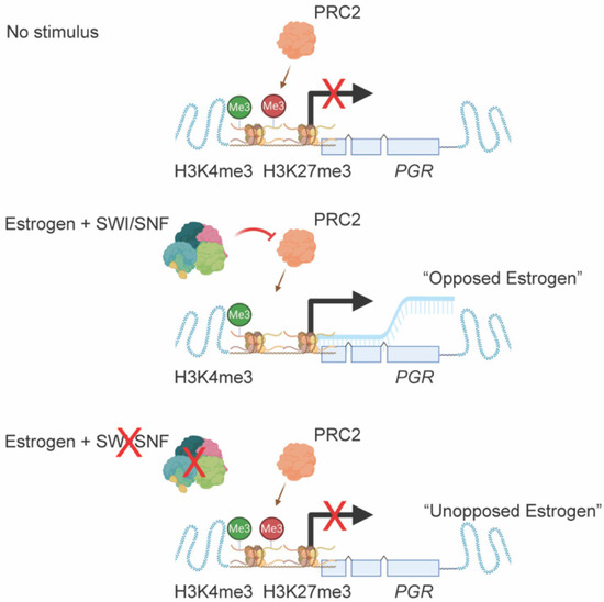 Figure 9. Model diagram representation of PGR (progesterone receptor) regulation by SWI/SNF (SWItch/Sucrose Non-Fermentable), PRC2 (polycomb repressive complex 2) and estrogen at sites with H3K27me3 (histone H3 lysine 27 trimethylation) and H3K4me3 (histone H3 lysine 4 trimethylation).