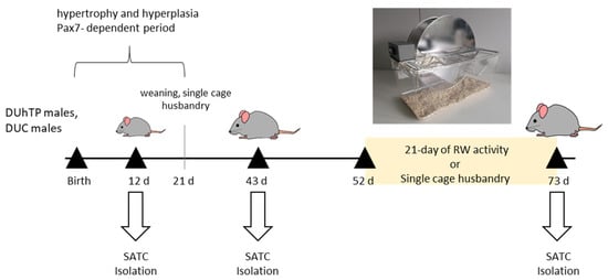 - Brooks, M.J.; Hajira, A.; Mohamed, J.S.; Alway, S.E. Voluntary Wheel Running Increases Satellite Cell Abundance and Improves Recovery from Disuse in Gastrocnemius Muscles from Mice. J. Appl. Physiol. 2018, 124, 1616–1628. [Google Scholar] [CrossRef]