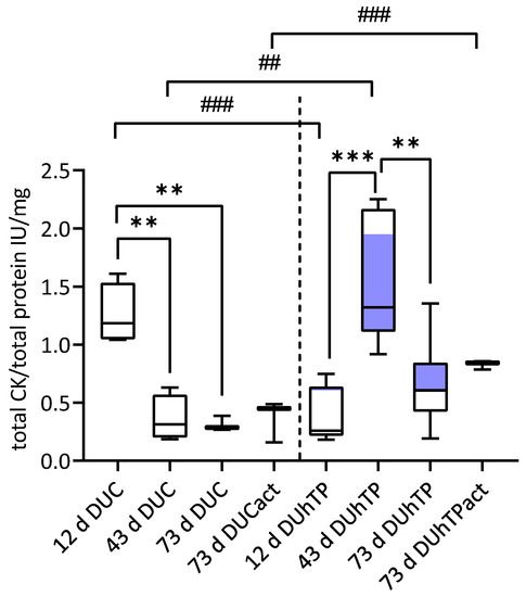 - John, L.; Bischoff, R. Differentiation of Creatine Phosphokinase During Myogenesis: Quantitative Fractionation of Isozymes. Dev. Biol. 1977, 57, 330–344. [Google Scholar]