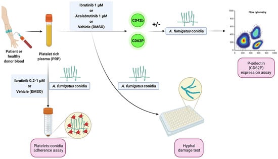 Experimental workflow. Platelet-rich plasma (PRP) from healthy donors and treatment-naïve CLL patients was treated with ibrutinib or acalabrutinib or vehicle (DMSO) for 60 min at 37 °C. Platelet adhesion to conidia was assessed by a spectrophotometric method. Surface expression of CD62P (P-selectin) was evaluated by flow cytometry at baseline and following stimulation by A. fumigatus conidia. Platelet-induced hyphal damage was measured by performing a colorimetric assay with XTT. Platelet-mediated antifungal activity was also evaluated in CLL patients before and after ibrutinib administration by cytofluorimetric analysis of P-selectin expression in response to A. fumigatus conidia.