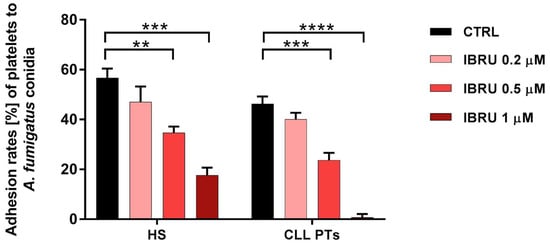 Ibrutinib inhibits adhesion of platelets to conidia. Platelets, treated or not treated with three different concentrations of ibrutinib (0.2 μM, 0.5 μM, and 1 μM), were incubated with A. fumigatus conidia, at an effector-to-target (E:T) ratio of 100:1 for 30 min at 37 °C, and then centrifuged at low intensity. Then, the OD700 of the supernatant was determined by spectrophotometer, and the percentage of platelet adhesion was calculated in relation to the OD700 of platelets and conidia alone (** p < 0.01; *** p < 0.001; **** p < 0.0001). HS, healthy subjects; PTs, patients; CTRL, control; IBRU, ibrutinib.