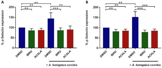 PRP treated with ibrutinib, acalabrutinib, or vehicle was labeled with anti-CD42b and anti-CD62P antibody. CD42b is a membrane glycoprotein constitutively expressed on platelet surface and is useful in identifying platelet population, while CD62P is a marker of activated platelets. Labeled platelets were then incubated with swollen, heat-inactivated A. fumigatus conidia at an E:T ratio of 100:1. After 30, 60, 90, 150, 210, and 270 min, samples were acquired and analyzed on a BD Accury C6 flow cytometry. Analysis was performed gating CD42b+ cells and analyzing the mean fluorescence intensity in the positive CD62P population. Results are reported as percentages of CD62b expression normalized on DMSO-treated unstimulated platelets (100%). Normalization was performed by dividing the value of ibrutinib- or acalabrutinib-treated, stimulated or unstimulated samples to the value of the corresponding DMSO-treated unstimulated samples and multiplying by 100.