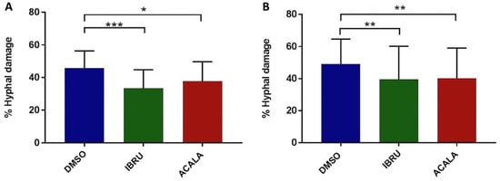 To further explore the effects of BTK inhibition on antifungal activity, we measured hyphal damage induced by ibrutinib, acalabrutinib, or vehicle-treated platelets by performing a colorimetric assay with XTT. Firstly, we confirmed the ability of platelets to impair germination of conidia and hyphal elongation by counteracting the fungal metabolic activity. Indeed, vehicle-treated platelets from six healthy donors and six CLL patients induced 46% (range 28–58%) and 44% (range 30–58%) mean hyphal damage, respectively. Moreover, we found that ibrutinib- and acalabrutinib-treated platelets showed a statistically significant reduced capacity to induce hyphal damage compared with vehicle-treated platelets. In particular, ibrutinib-treated platelets induced 34% (range 17–50%) and 33% (range 12–51%) mean hyphal damage in healthy volunteers and CLL patients, respectively. Similarly, acalabrutinib-treated platelets induced 38% (range 24–55%) and 34% (range 17–51%) mean hyphal damage in healthy donors and CLL patients, respectively (Figure 4).