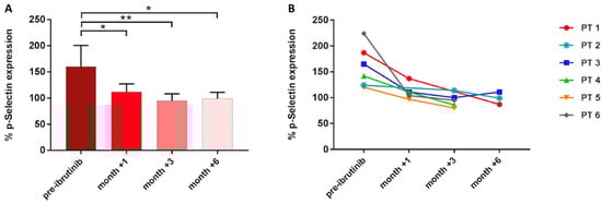 Platelet-mediated antifungal activity in CLL patients (PT) under ibrutinib. Bar (A) and line graph (B) showing P-selectin expression in samples collected before starting ibrutinib and during the course of treatment (* p < 0.05; ** p < 0.01).