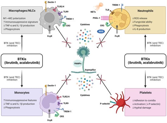 Several studies have demonstrated that BTK inhibition by either ibrutinib or acalabrutinib can compromise the ability of neutrophils, monocytes, normal human macrophages, and NLCs to counteract the fungal growth in vitro [,,,]. However, acalabrutinib has not yet been associated with an increased risk for IFIs in treated patients and has already been shown to have different influences on both innate and adaptive immunity compared with ibrutinib [,,]. Of note, ibrutinib, unlike other more selective BTKis (acalabrutinib and zanubrutinib), has been proposed as a new predisposing factor for IFIs and incorporated as a novel host factor for the definition of probable invasive pulmonary mold disease by the European Organization for Research and Treatment of Cancers (EORTC) and the Mycoses Study Group (MSG) [].