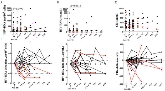 Anti-PD-1 therapy in PLWH with cancer does not significantly impact the biology of HIV. (A), HIV-DNA (cp/106cells) (upper panel) and HIV-DNA (log10 cp/106 cells) delta from baseline (lower panel), (B), HIV-RNA (cp/mL) (upper panel) and HIV-RNA (log10 cp/mL) delta from baseline (lower panel), (C), CD4 count (/mm3) (upper panel) and CD4 count (/mm3) delta from baseline (lower panel). Dotted lines denote decrease ≤ 0.5 log10 for CA HIV-DNA and increase ≥ 0.5 log10 for HIV-RNA. Red color denotes the RR patients represented with different shapes. EOT: end of treatment. Bonferroni corrected p-value: p ≤ 0.007, Wilcoxon-matched pairs signed Rank test. At cycle 1, n = 32; at cycle 2, n = 29; at cycle 3 or 4, n = 29; at cycle 9, n = 11; at cycle 15, n = 5; at cycle 27, n = 3; at cycle 51, n = 1; at end of treatment, n = 5. Experiments were monoplicates.
