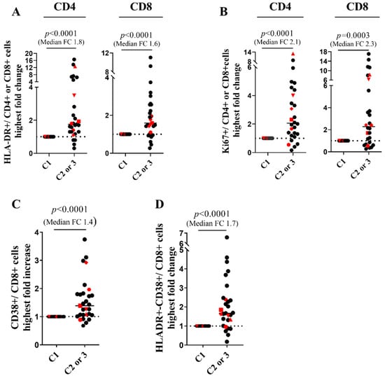 Anti-PD-1 treatment in PLWH with cancer results in T cell immunological activation. (A), Highest fold change at C2 or 3 from baseline in HLA-DR + cells among CD4+ and CD8 + T cells. (B), Highest fold change at C2 or 3 from baseline in Ki67+ cells among CD4+ and CD8+ T cells. (C), Highest fold change at C2 or 3 from baseline in CD38+ cells among CD8+ T cells. (D), Highest fold change at C2 or 3 from baseline in CD38 + HLA-DR + cells among CD8 + T cells. Red spots denote the RR patients and dotted lines denote fold change of 1. Wilcoxon- signed Rank test. FC: fold change. Experiments were monoplicates.