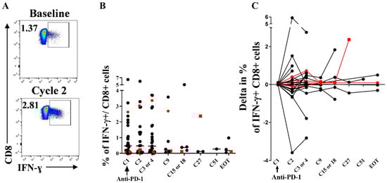 Anti-PD-1 therapy in PLWH with cancer does not significantly increase the in vivo frequency of HIV-specific CD8 + T cells. Thawed PBMC were stimulated during 6 h with HIV peptides (15 mers overlapping peptides covering RT, Nef and Gag) and then stained with intra-cellular anti-cytokine antibodies (anti-IFN-ɣ, anti- IL-2 and anti-TNF-α). HIV-specific CD8 + T cells were defined as IFN- ɣ producing CD8 + T cells after HIV stimulation. (A), Example dot plots of IFN-ɣ expression among CD8 + T cells after HIV stimulation at baseline and at cycle 2. (B), frequency of HIV-specific CD8+ T cells under ICB. (C), HIV-specific CD8 + T cells delta from baseline under ICB. Red colors denote the RR patients. EOT: end of treatment. At cycle 1, n = 32; at cycle 2, n =29; at cycle 3 or 4, n= 29; at cycle 9, n = 11; at cycle 15, n =5; at cycle 27, n = 3; at cycle 51, n = 1; at end of treatment, n = 5. Experiments were monoplicates.