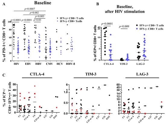 In PLWH with cancer, high levels of ICP expression are detected on HIV-specific T cells, without upregulation on anti-PD-1 therapy. Thawed PBMC were stimulated during 6 h with viral peptides and then stained with intra-cellular anti-cytokine antibodies (anti-IFN-ɣ, anti-IL-2 and anti-TNF-α). HIV-specific CD8 + T cells were defined as IFN- ɣ producing CD8+ T cells after HIV stimulation. (A), PD-1 expression among specific (black spots) and non-specific (blue square) CD8 + T cells at baseline depending on viral stimulations. Mann Whitney test. (B), CTLA-4, TIM-3 and LAG-3 expression among HIV-specific and non-specific CD8 + T cells after HIV stimulation (n = 18). Mann Whitney test. (C), expression of CTLA-4 (left), TIM-3 (middle) and LAG-3 (right) on HIV specific CD8 + T cells overtime. Red spots denote the patients with reservoir reduction. EOT: end of treatment. At cycle 1, n = 32; at cycle 2, n =29; at cycle 3 or 4, n= 29; at cycle 9, n = 11; at cycle 15, n =5; at cycle 27, n = 3; at cycle 51, n = 1; at end of treatment, n = 5. Experiments were monoplicates.