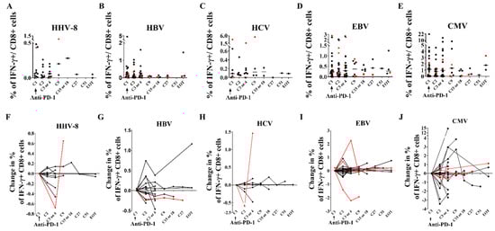 Anti-PD-1 therapy in PLWH with cancer does not significantly increase the frequency of virus-specific CD8 + cells. Thawed PBMC were stimulated during 6 h with viral peptides and then stained with intra-cellular anti-cytokine antibodies (anti-IFN-ɣ, anti-IL-2 and anti-TNF-α). Virus-specific CD8 + T cells were defined as IFN- ɣ producing CD8+ T cells after viral stimulation. Frequencies of (A), HHV-8, (B), HBV, (C), HCV, (D), EBV, and (E), CMV-specific-CD8+ T cells overtime. Delta from baseline of (F), HHV-8, (G), HBV, (H), HCV, (I), EBV, and (J), CMV-specific CD8 + T cells under ICB. Red colors denote the patients with reservoir reduction. EOT: end of treatment. Experiments were monoplicates.