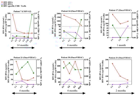 Immunovirological- profiles of the six PLWH patients treated with anti-PD-1 with a CA HIV-DNA decrease ≥ 0.5 log10. In each graph, red inverted triangles represent HIV-DNA (cp/106 cells), purple triangles represent HIV-RNA (cp/mL) and green squares represent HIV-specific CD8 + cells (% of total CD8 + T cells). Dotted lines represent CA HIV-DNA = 40 cp/106 cells, which is the detection threshold. EOT: end of treatment. The frequency of HIV-specific CD8 + T cells was not available for patient #31. Experiments were monoplicates.