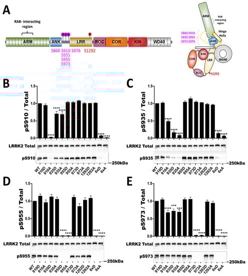 In cellulo phosphorylation profile of LRRK2 phosphosite mutants. Western blot analysis of HEK293T cell lysates after transfection of LRRK2 phosphomutants. LRRK2 protein domain representation with studied phosphorylated sites (heterologous sites are represented in purple and autophosphorylation site in red). (A) Schematic representation of LRRK2 domains, as well as the spatial arrangement of LRRK2 domains, indicating locations of phosphosites studied in the present work as well as the reported RABs interaction region. Unresolved portions of the structure are represented as dashes. Adapted from []. The ratio of phosphorylated site over total LRRK2 signal is shown in (B) for S910, (C) for S935, in (D) for S955 and in (E) for S973. The blot image for total LRRK2 is reused for illustration purposes in (B–E). The data represents the mean ± SEM from four independent experiments. The quantification of the signals was done by using Typhoon FLA 9500 and ImageQuant software (ImageQuant Tl (IQTL) 8.1, GE Healthcare, Chicago, IL, USA). The data were analyzed by One-way-ANOVA followed by a Dunnett’s test, using the WT condition as control. (*** p < 0.001), (**** p < 0.0001).