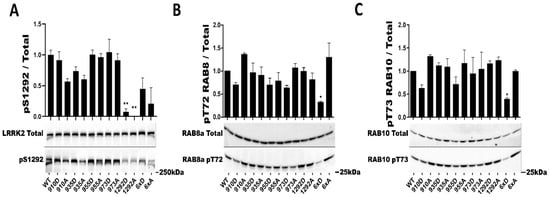 3.1. LRRK2 Phosphorylation Is Affected by Its Phosphorylation Mutants