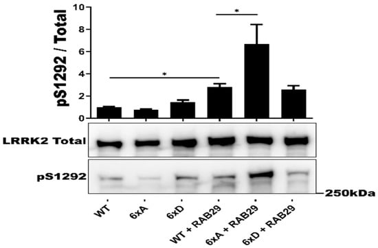 We then tested whether or not LRRK2 6xD could trigger dephosphorylation of RAB29 (Alias RAB7L1), a PD risk factor that has previously been reported as an interactor and substrate of LRRK2 [,]. Expression of the LRRK2 phosphorylation mutants 6xA and 6xD did not induce changes in RAB29-T72 phosphorylation compared to LRRK2 WR (Supplementary Figure S3). In this experiment, we decided to also test for effects of RAB29 on LRRK2, given previous reports that RAB29 overexpression activates autophosphorylation of LRRK2 at S1292 []. In this experiment, we found that expression of RAB29 led to an activation of LRRK2-S1292 phosphorylation of LRRK2 6xA that was 6-fold higher compared RAB29 induced activation of LRRK2-WT or LRRK2-6xD (Figure 3).