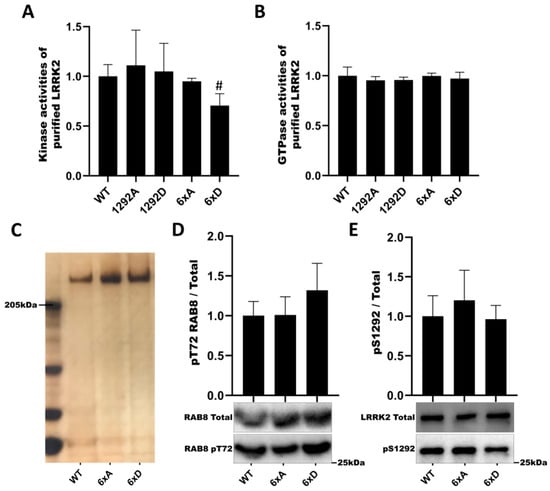 Next, we assayed LRRK2 phosphomutants for in vitro kinase activity (LRRKtide peptide phosphorylation in the presence of 32P-γ-ATP) and GTPase activity (hydrolysis of 32P-γ-GTP). Mutants of phosphorylation site S1292 (S1292A, S1292D) had no effect on either activity (Figure 4A,B). However, in the multi-mutant LRRK2 6xD, kinase activity showed a trend to decrease (p = 0.0549) (Figure 4A). As we identified LRRK2 6xD to present in cellulo a decreased phosphorylation activity on RAB8a and RAB10, we tested LRRK2 multi-mutants for in vitro kinase assay on recombinant RAB8a. In addition, we verified the thermal stability of purified LRRK2 proteins and found that WT LRRK2 is of comparable stability to the LRRK2 6xA and LRRK2 6xD mutants (Supplementary Figure S4, while confirming a subtle improvement in thermal stability in the Hepes pH 8.2 buffer compared to the Tris buffers []. The losses of pT72-RAB8 and pS1292-LRRK2 phosphorylation observed in cellulo for the LRRK2-6xD mutant were not replicated in vitro and are not explained by changes in LRRK2 stability in vitro (Figure 4C–E).