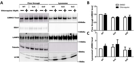 Abundance of LRRK2 in purified lysosomes. Lysosomes were magnetically isolated from HEK293T cells expressing 3xFLAG-LRRK2 and phosphorylation mutants as described in the Materials and Methods. Cells were treated with chloroquine 50 µM for 24 H to induce LRRK2 enrichment to lysosomes. Levels of LRRK2 in the flow through and in the lysosomes isolated are quantified by Western blotting (A). Relative abundance of LRRK2 in flow through (B) and in isolated lysosomes (C) is normalized with LAMP2 levels. The data represents the mean ± SEM from three independent experiments and are analyzed by one sample t-test (* p < 0.05).