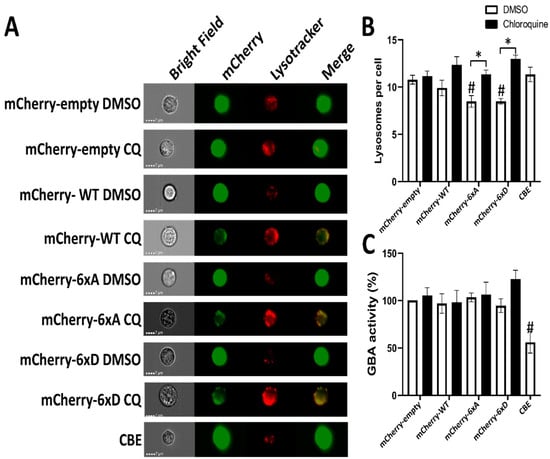 Lysosotracker analysis PC12 cells expressing WT and phosphomutant LRRK2 treated with and without chloroquine via imaging flow cytometry (ImageStream MKII, Amnis®®). PC12 cells were incubated with lysotracker for 1 h and subjected to ImageStream analysis. (A) Representative images of PC12 cells labeled with lysotracker, showing red colored positive spots corresponding to lysosomes. Green colored for LRRK2 staining. (B) Quantification of the number of spots imaged per cell. (C) Activity of GBA in each experimental condition is quantified. Data represent the mean spots detected from each condition. The data were analyzed by One-way-ANOVA followed by Dunnett’s test for multiple comparisons, using the mCherry-empty condition as control. (# p <0.05) or with one-sample t-test (* p < 0.05). (n = 4 independent experiments, 3000–5000 cells were analyzed per condition in each experiment).