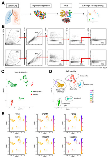Single-cell sequencing of healthy and IPF lung epithelium identifies common epithelial cell types as well as gene expression differences between healthy and diseased cells. (A) Workflow from tissue dissociation to single-cell sequencing. (B) Epithelial enrichment by FACS. Top row: Healthy lung tissue. Bottom row: IPF lung tissue. (C) UMAP plot showing sample identity of sequenced cells. (D) UMAP plot showing sequenced cells clustered according to gene expression. (E) UMAP plots showing the expression of known epithelial cell markers.