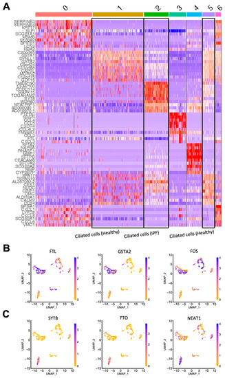 Next, we identified the top differentially expressed genes in the IPF ciliated cell cluster in comparison to the clusters of healthy ciliated cells. The most differentially expressed genes of interest were selected by sorting the genes expressed in clusters 1 and 5 (healthy ciliated cells) and cluster 2 (IPF ciliated cells) by the lowest p-value followed by the highest fold change in gene expression. Figure 3B shows the top three upregulated genes of interest in healthy ciliated cells vs. IPF ciliated cells: FTL, GSTA2 and FOS. Correspondingly, Figure 3C shows three genes of interest that were highly upregulated in IPF ciliated cells: SYT8, FTO and NEAT1. FTL encodes the light chain of Ferritin, a protein consisting of several subunits that is responsible for intracellular iron storage as well as transport of excess iron [13]. Interestingly, excess iron accumulation in the lung has been associated with IPF and has been shown to contribute to IPF pathogenesis [14]. SYT8 is a regulator of exocytosis, which in turn can influence the microenvironment of the lung and lead to disease development [15]. FTO and NEAT1, though not previously characterized in IPF, have both been implicated in promoting various forms of lung cancer [16,17,18].
