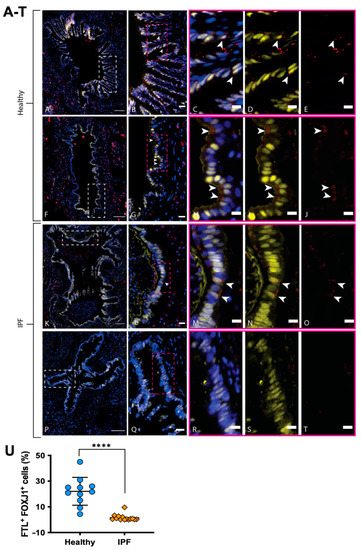 Among the genes of interest that were differentially expressed in ciliated cells, FTL was upregulated in healthy individuals in comparison to IPF patients. Since iron accumulation in IPF lung tissue has been implicated in pathological progression [20] and is partly controlled by FTL [13], healthy and IPF tissue sections were stained for FTL together with FOXJ1 in order to verify our single-cell RNA analysis at the protein level, since FTL is known to be post-transcriptionally regulated [21]. In line with the RNA sequencing, antibody labeling of distal lung tissue detected an increase in cells costained for FTL (red) and FOXJ1 (yellow) in healthy airways in comparison to IPF airways (Figure 4). FTL was found to be expressed in ciliated airways of healthy distal lung tissue (Figure 4A–J), seen at the apical end of FOXJ1+ ciliated cells (Figure 4C–E,H–J). In contrast, in IPF ciliated airways, the FTL protein expression was more sporadic (Figure 4K–O), and in some airways very little expression was found (Figure 4P–T). Nevertheless, in some IPF airways, we found signs of ongoing inflammation with FTL-expressing macrophages (Figure 4K). This is in line with other studies showing strong FTL expression in macrophages [22], and validates our staining assays.
