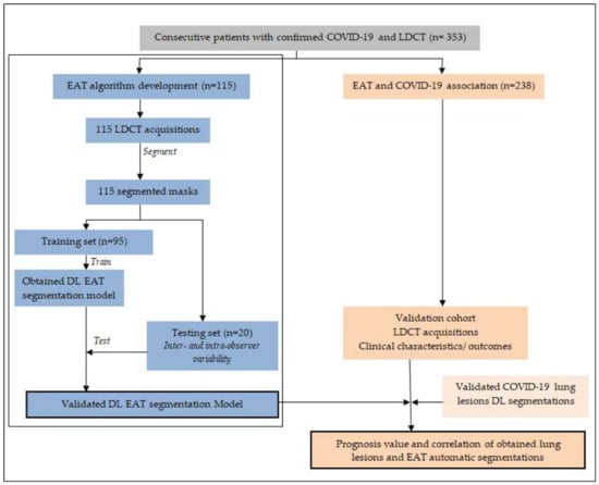Our main purpose was to develop and evaluate a complete DL pipeline that allows a fully automated segmentation of EAT volume that could be used on LDCT in association with a pre-existing COVID-19 lung lesions segmentation tool. We also aimed to investigate the association between EAT volume and lung lesion extent in a COVID-19 cohort and the impact of EAT volume on patient prognosis.