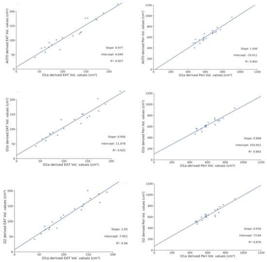 Correlations of EAT and Peri volume measures for the automatic and manual segmentation of the intra- and interobserver measures. Peri Vol: pericardial volume; EAT Vol: epicardial adipose tissue volume; O1a: initial segmentations made by Observer 1. O1b: second segmentations made by Observer 1; O2: Segmentation made by Observer 2. The blue line is the fitted regression line.