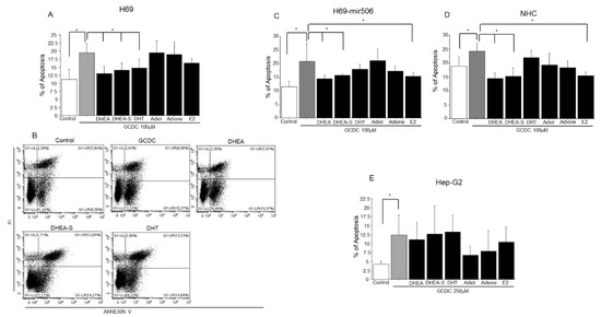 Given that an impaired cholangiocyte response to estrogen characterizes the terminal ductopenic stage of disease (where apoptosis of cholangiocytes is enhanced), the involvement of DHEA and its metabolites in protecting against apoptosis, induced by bile acid (GCDC), was examined. Cells were incubated with DHEA, DHEA-S, E2, adiol, adione or DHT, followed by GCDC incubation (100 μM for NHC, H69 and H69-miR506 cells or 250 μM for Hep-G2 cells) for 24 h. Flow cytometry analysis revealed that DHEA and DHEA-S reduced apoptosis in NHC, H69 and H69-miR506 cells (p < 0.05; Figure 2A–D). In addition, DHT diminished apoptosis in H69 cells (p < 0.05; Figure 2A). Furthermore, E2 significantly reduced GCDC-induced apoptosis in NHC and H69-miR506 cells (p < 0.05; Figure 2C,D). DHEA and its metabolites did not affect GCDC-induced apoptosis in Hep-G2 cells (Figure 2E).