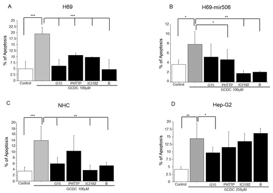 Involvement of estrogen and androgen receptors in the apoptosis induced by GCDC in cholangiocytes (H69, H69-miR506, NHC) and hepatocytes (Hep-G2). Cells (A–D) were incubated with estrogen (GPER, ER-α, and ER-β) or androgen receptor inhibitors i.e., G15 (12 nM); ICI 182,780 (2 nM); PHTTP (10 nM), and bicalutamide (B) (10 nM), followed by GCDC treatment. After 24 h, cells were harvested by scraping and then incubated with Annexin V-FITC (1 ng/mL) and propidium iodide (5 ng/mL) for 30 min in the dark. They were analyzed by CytoFLEX LX flow cytometry, * p < 0.05; ** p < 0.01, *** p < 0.001.